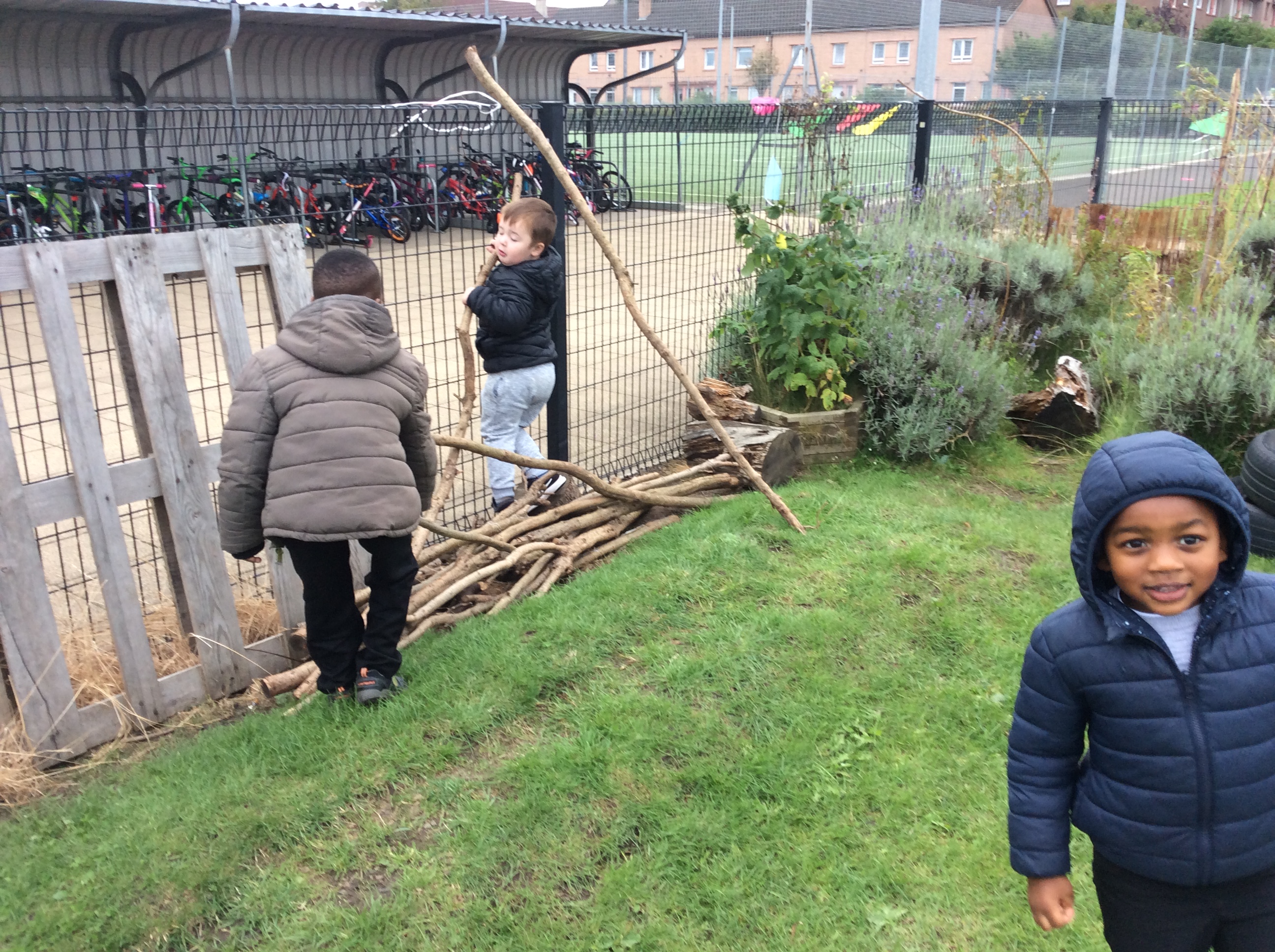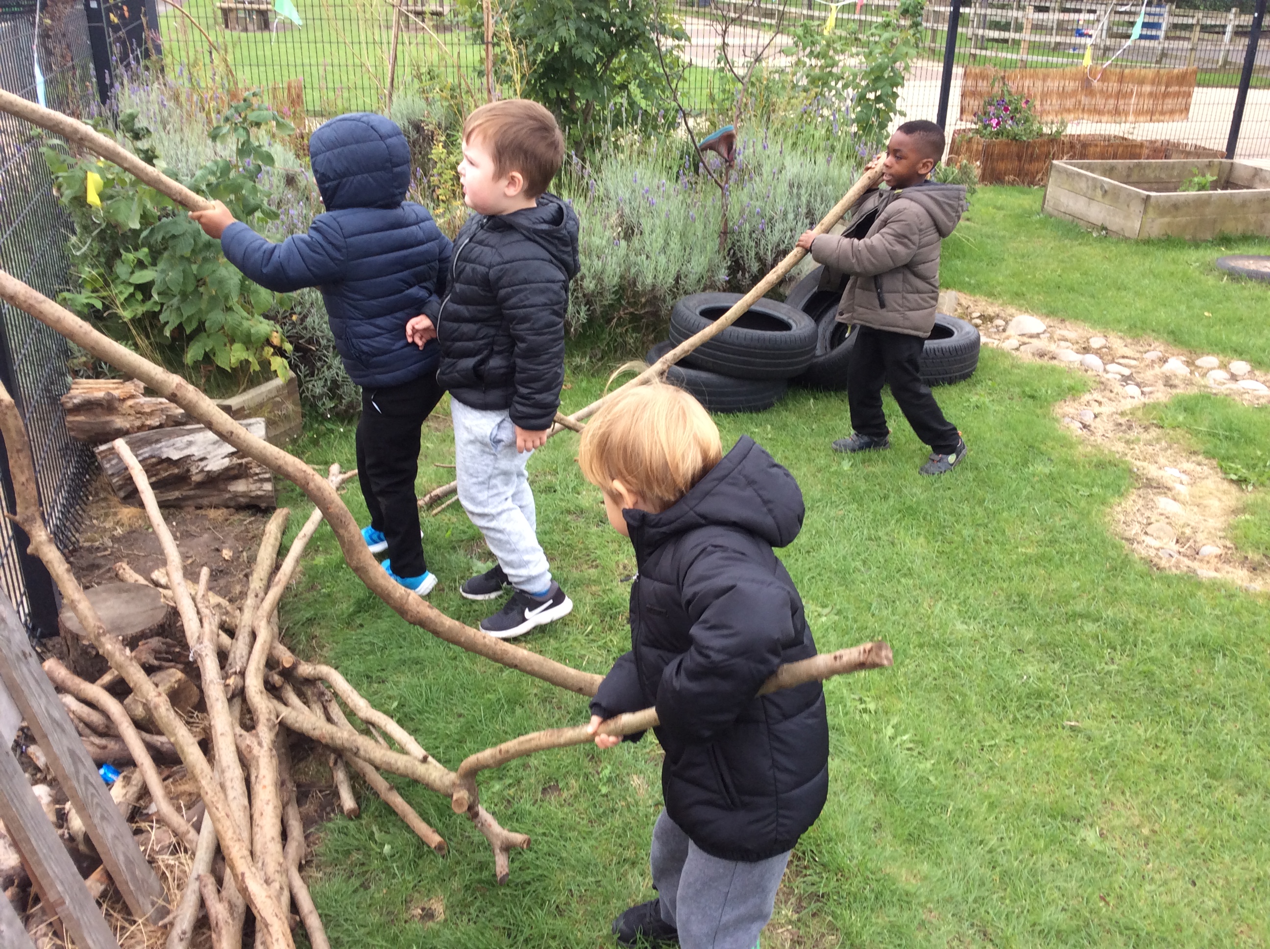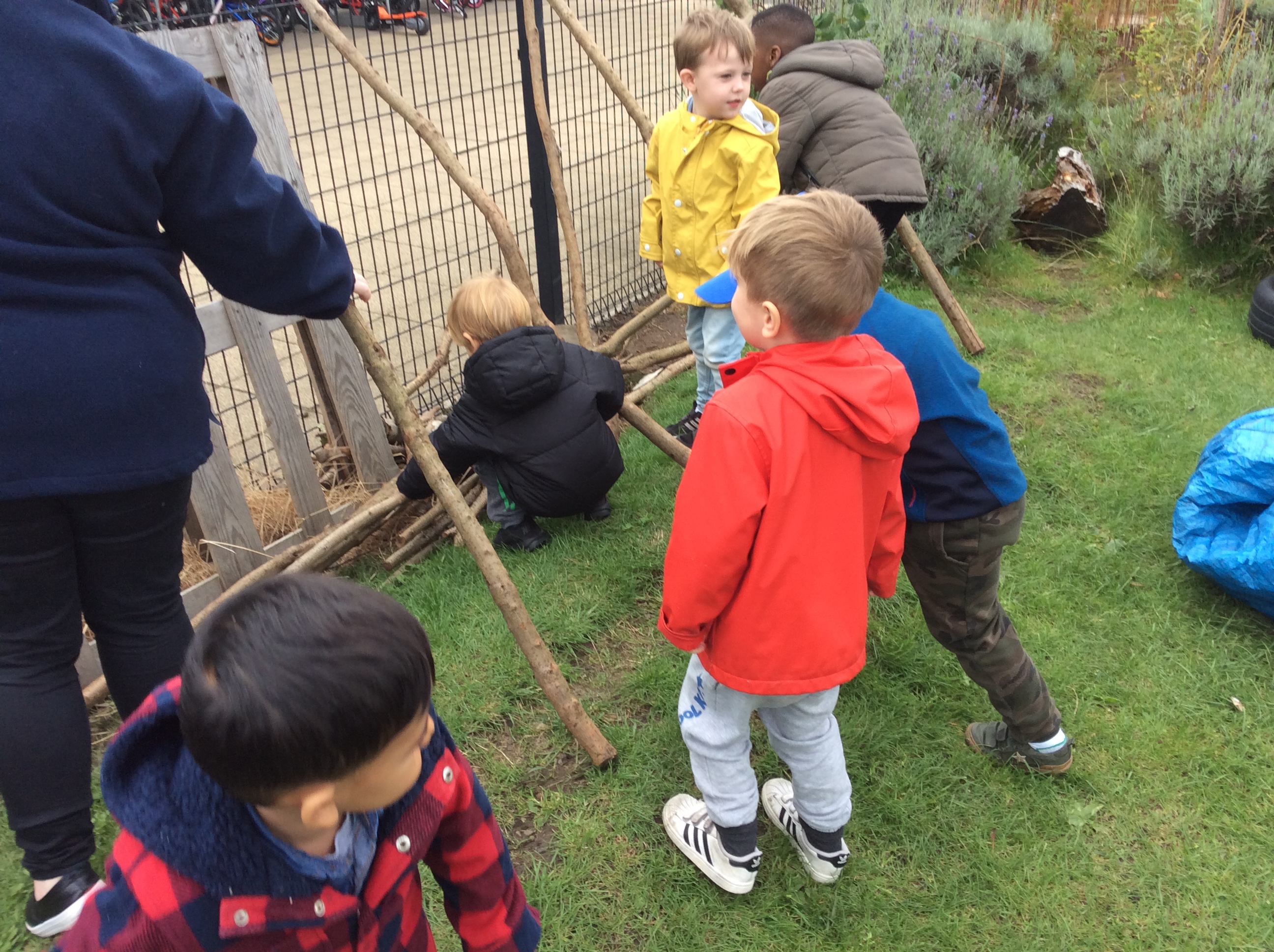 The Morning and Afternoon nursery children decided that they needed some shelter from the wind and rain this week. Making a den was a huge success! all we needed were some long sticks and a tarpaulin.