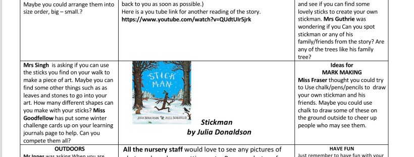 Here is the nursery week one home Learning grid. It is based on the story of Stickman by Julia Donaldson.